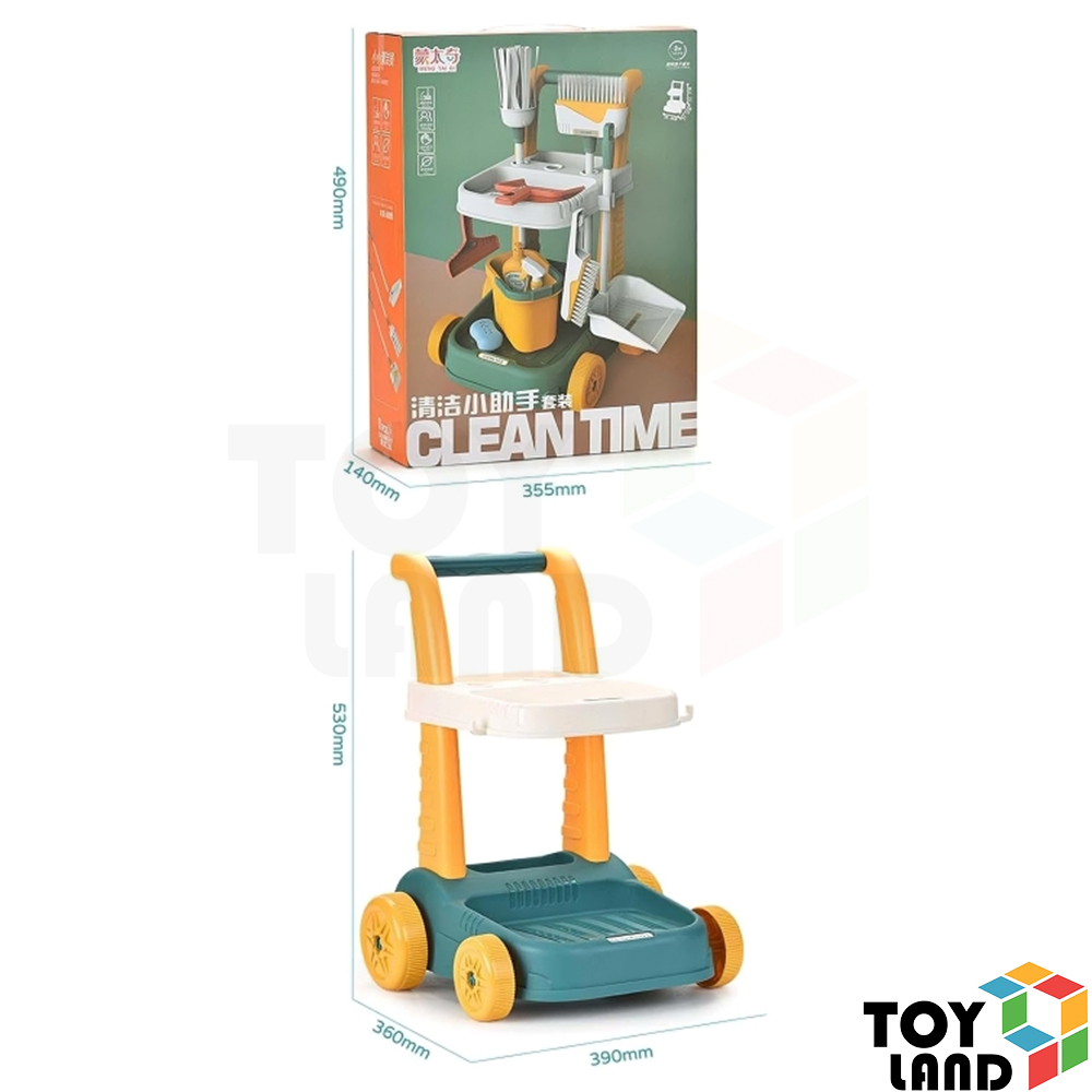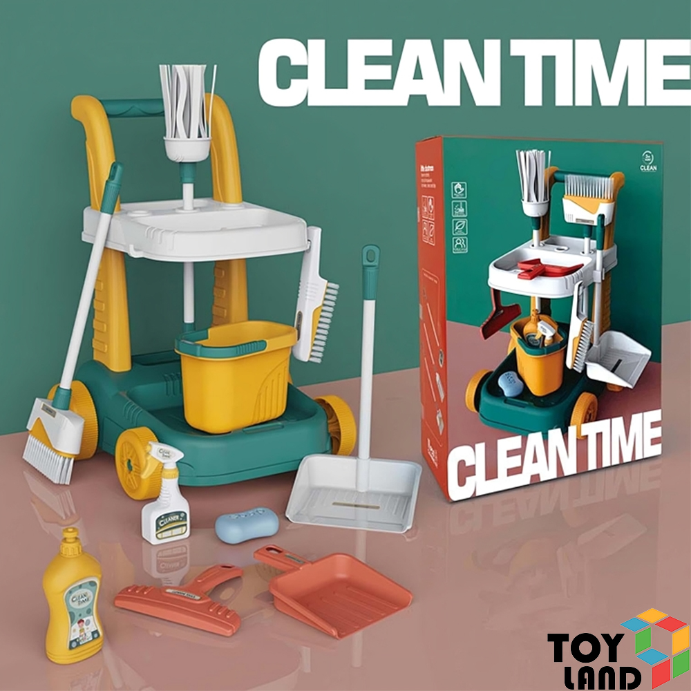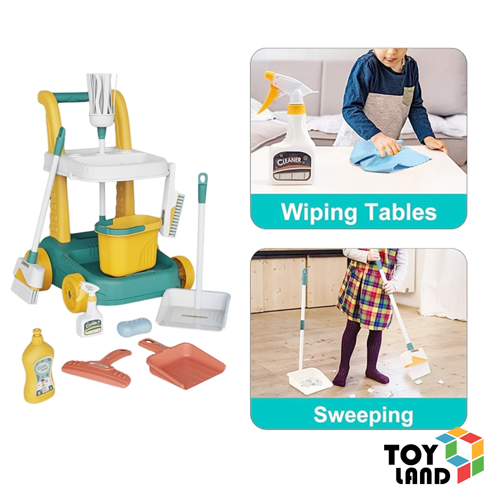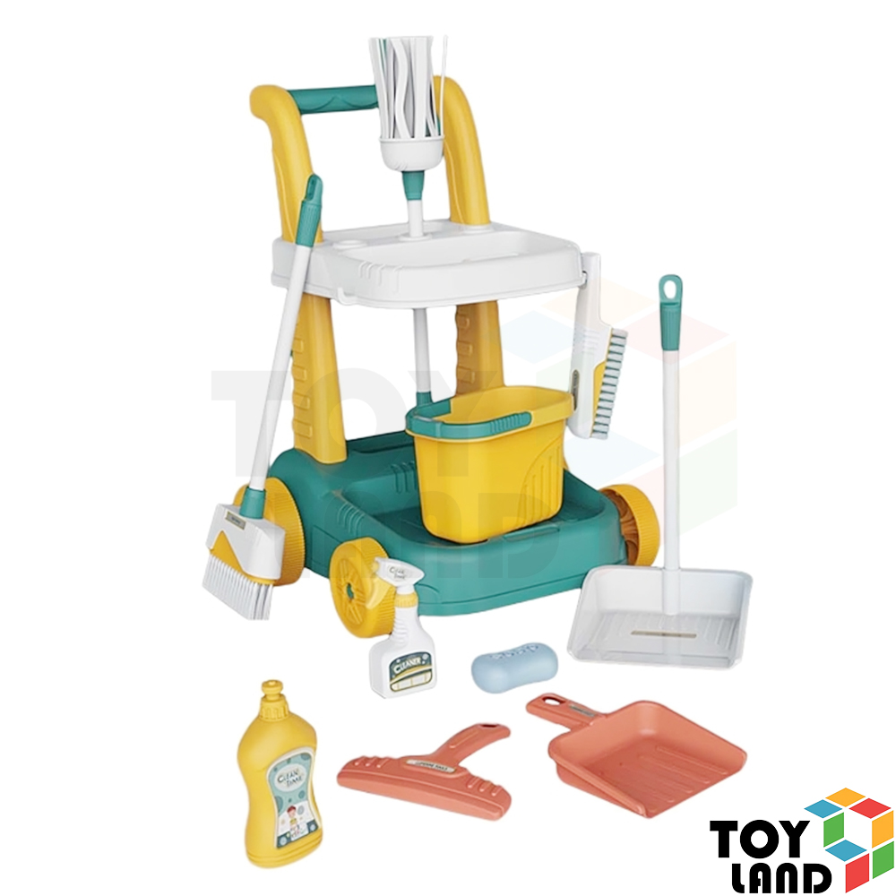 عربة أدوات نظافة للأطفال مزودة بممسحة، جردل، فرش وأدوات تنظيف متنوعة، لتعليم الأطفال النظام والنظافة بطريقة ممتعة ومسليّة. 🧹✨