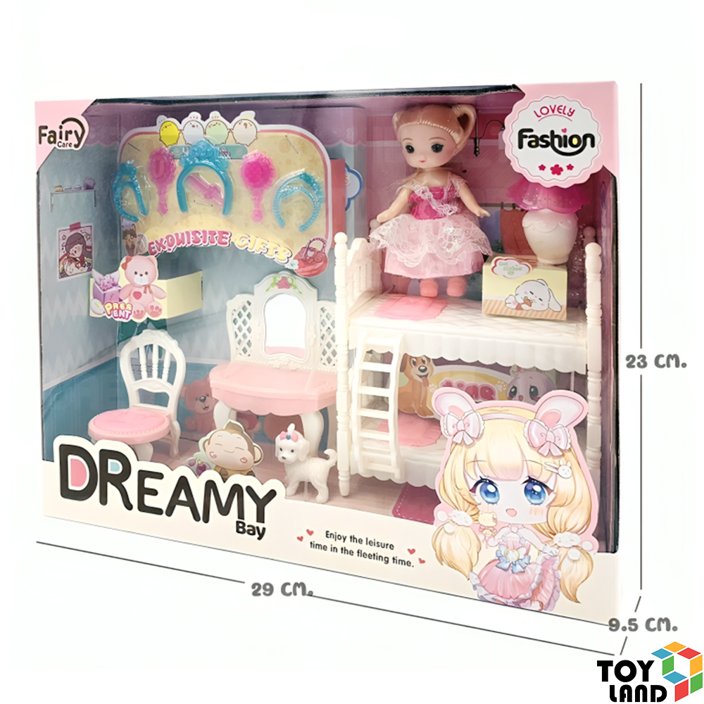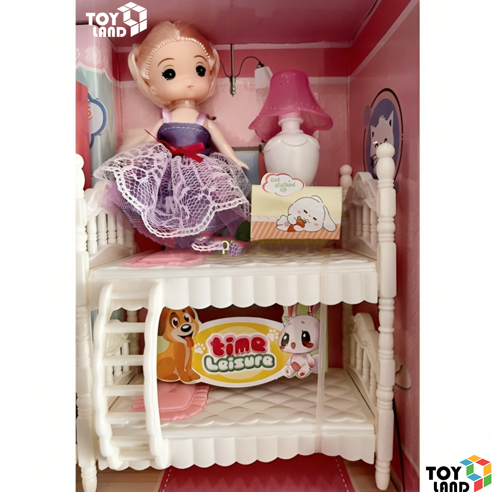 تتضمن اللعبة عروسة جميلة مع سرير بطابقين وطاولة تسريحة أنيقة وكراسي بتفاصيل ناعمة تشبه عالم الأميرات.
