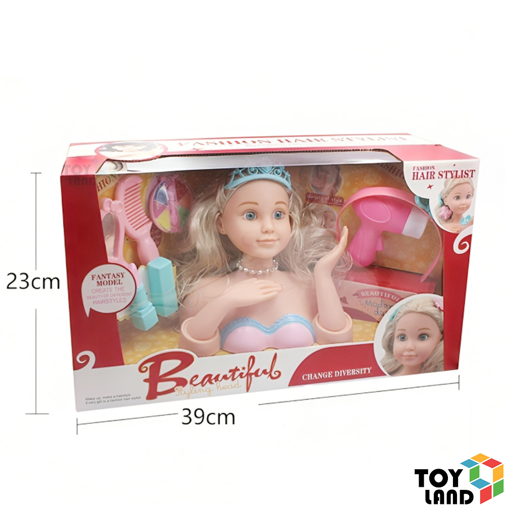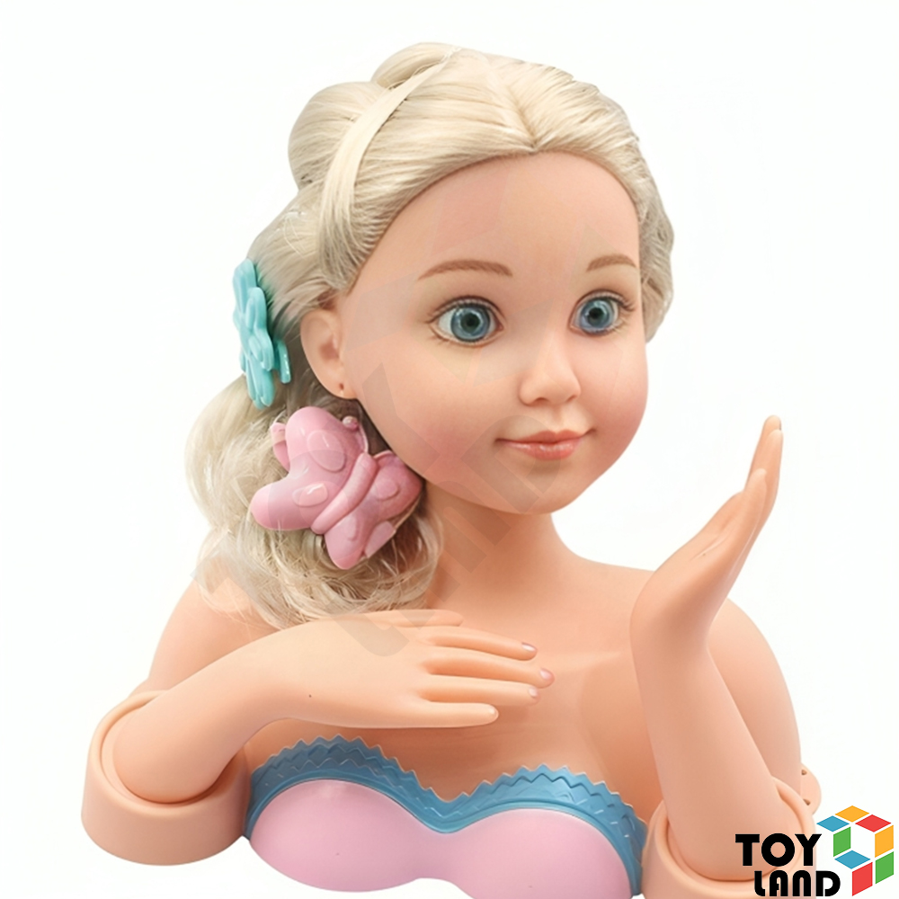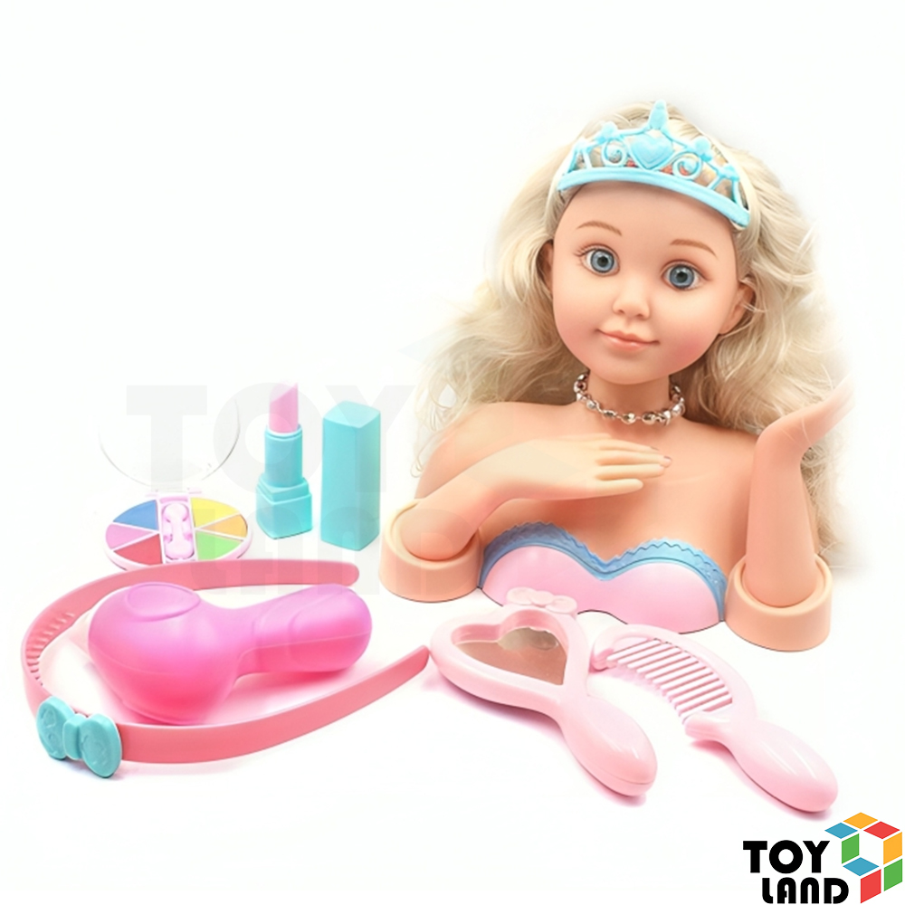 رأس عروسة للتزيين مع مجموعة من أدوات التجميل والتسريح، تمنح الأطفال تجربة ممتعة لتعلم العناية بالشعر والمكياج وتنمية مهارات الإبداع والخيال. 💄✨👑