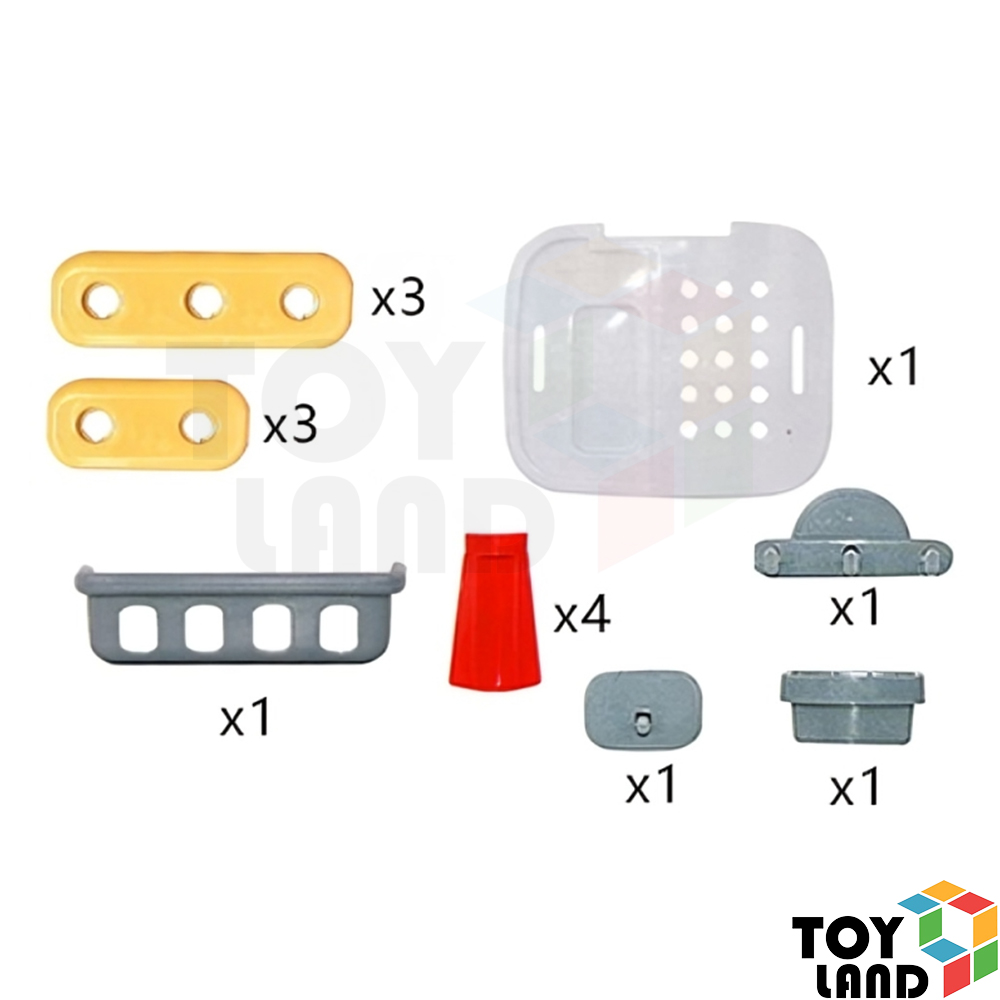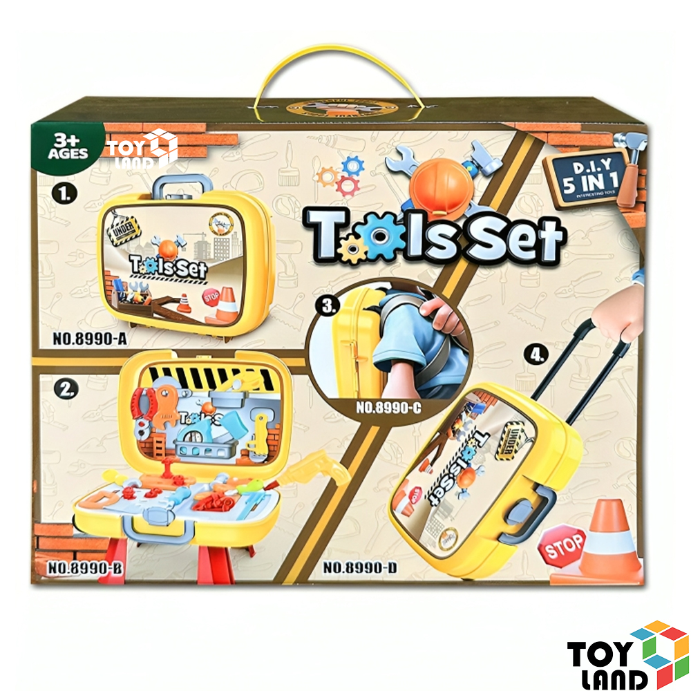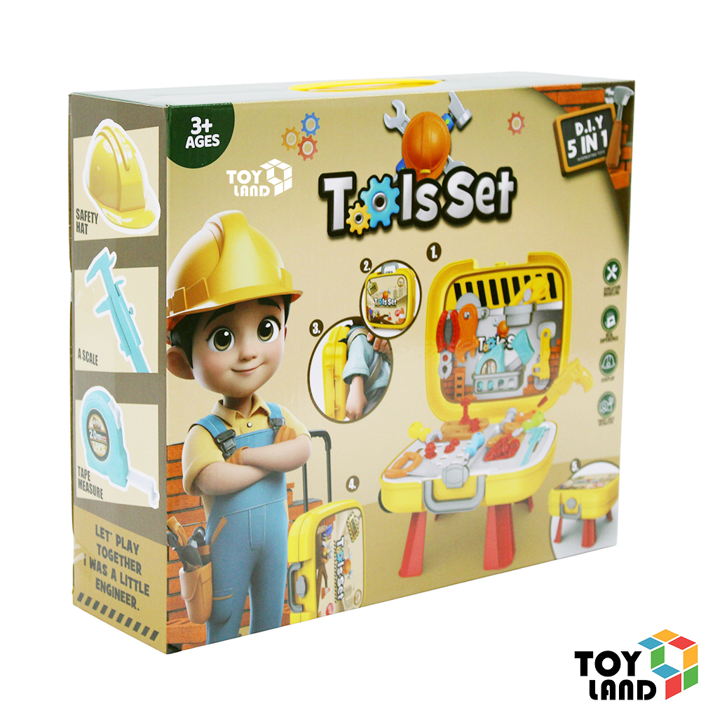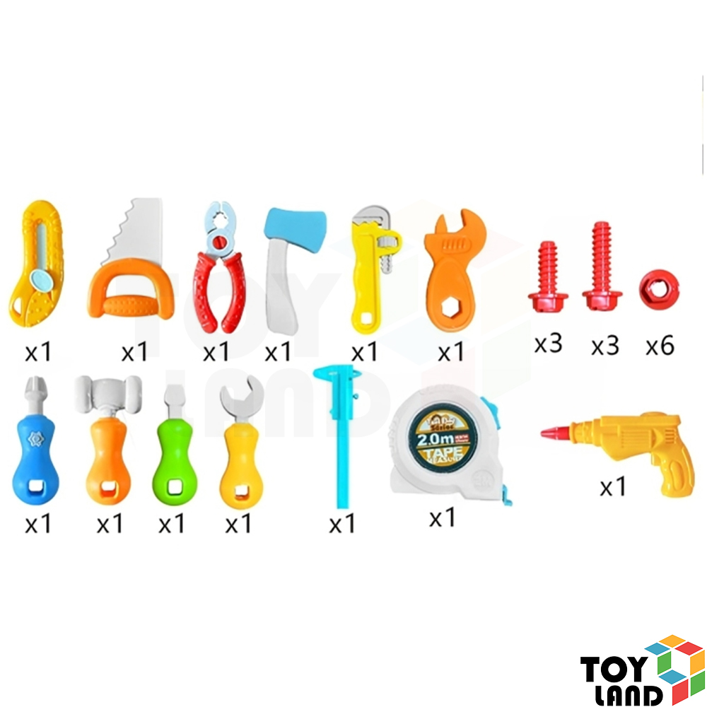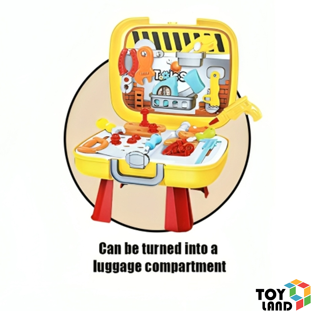 تأتي الشنطة بتصميم عملي يحتوي على مجموعة من أدوات النجارة الآمنة والمخصصة للأطفال، مثل المطرقة والمفك والمنشار والمسامير البلاستيكية.