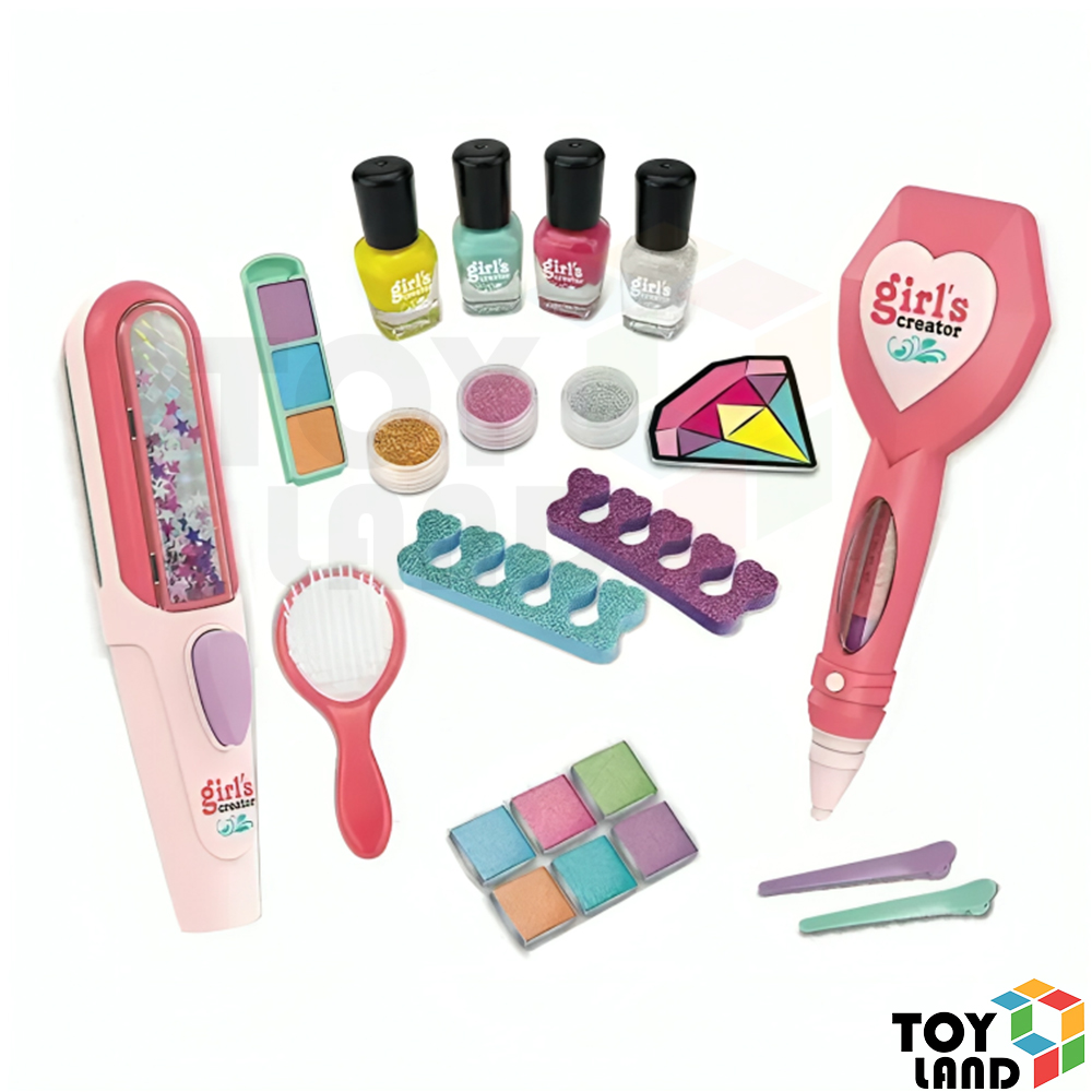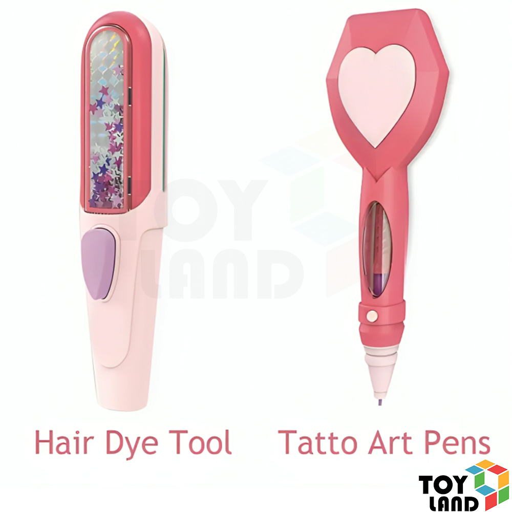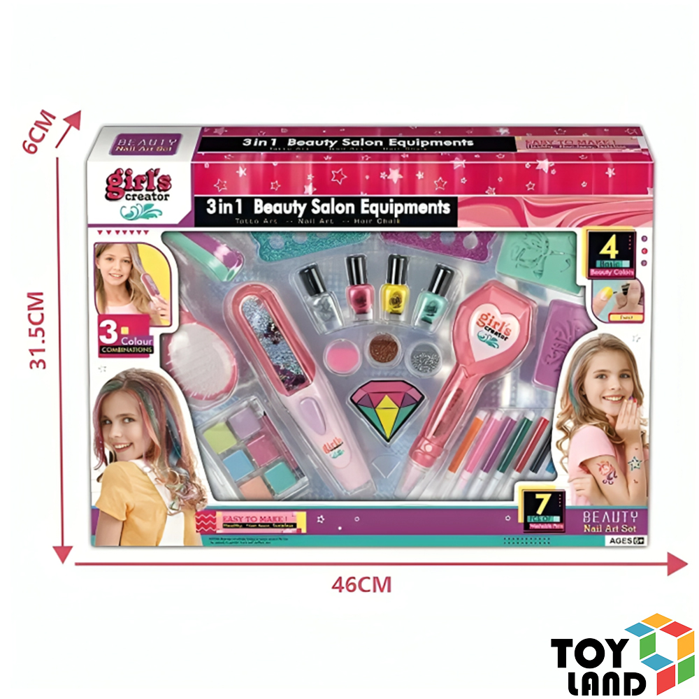 مجموعة تجميل 3 في 1 للبنات، تشمل أدوات صبغ الأظافر، تلوين الشعر، ورسم التاتو!تحتوي على أكثر من 30 قطعة ممتعة مثل طلاء أظافر، ألوان شعر، فرشاة، ملصقات، وأقلام فنون التاتو.مثالية لهدايا البنات ومحبي اللعب الإبداعي والصالونات الخيالية.