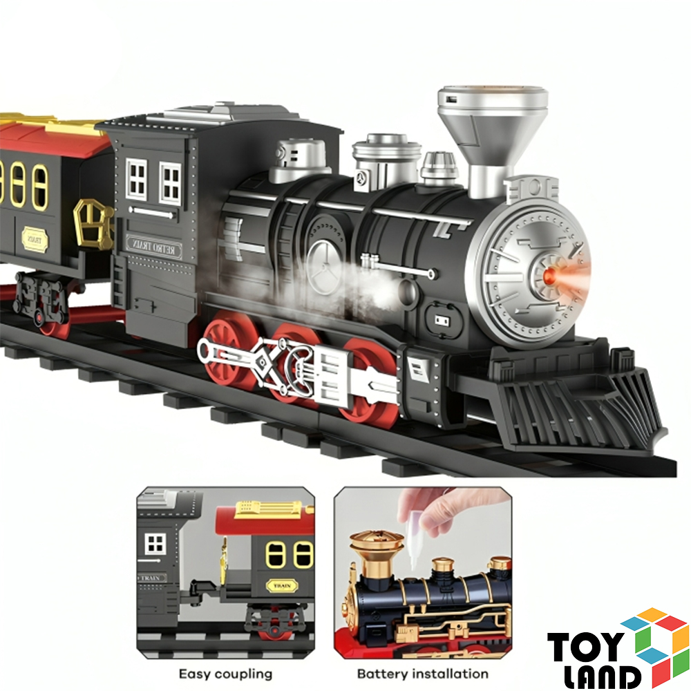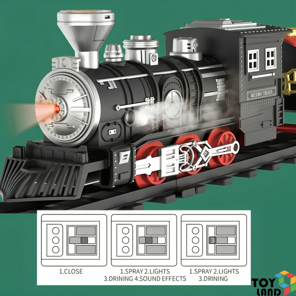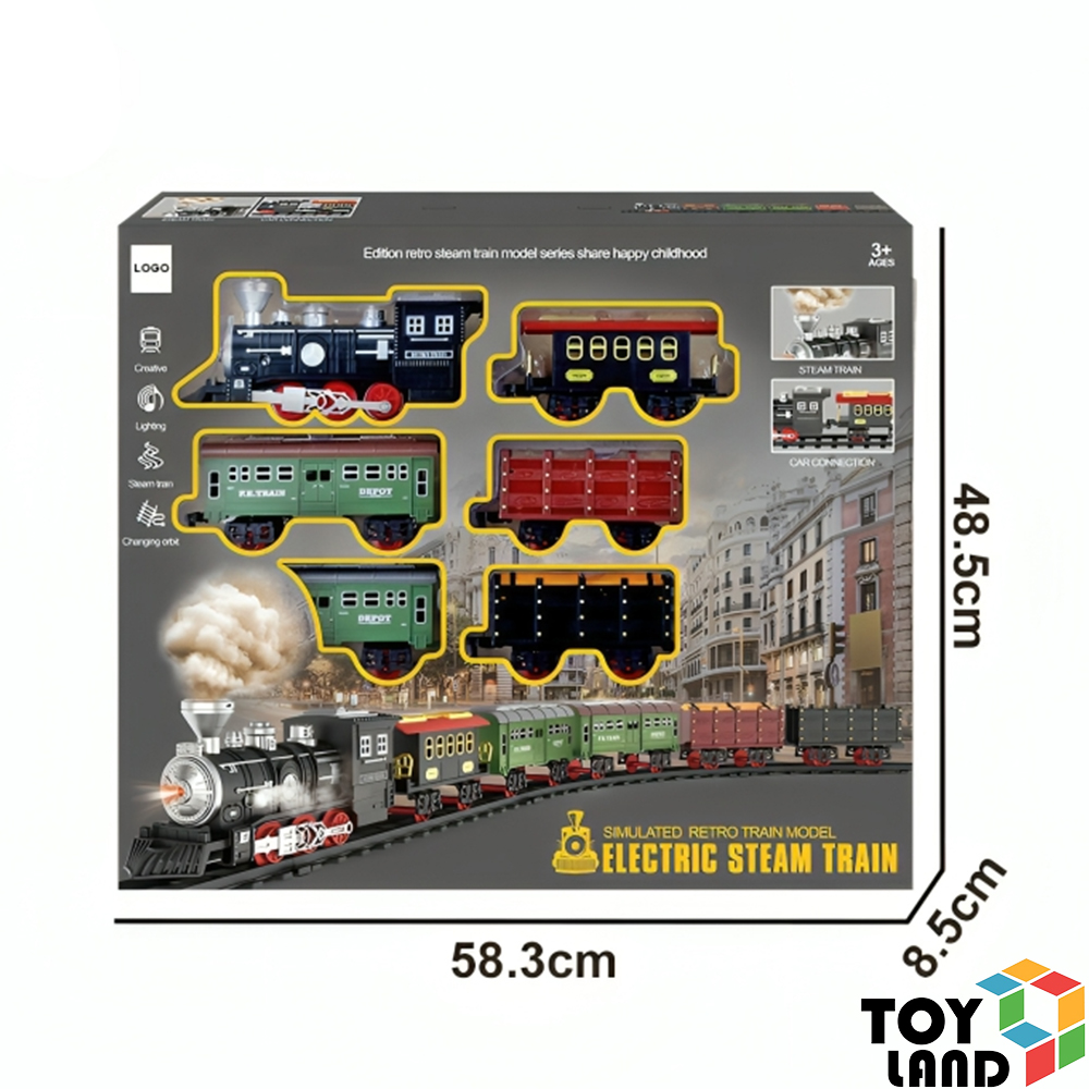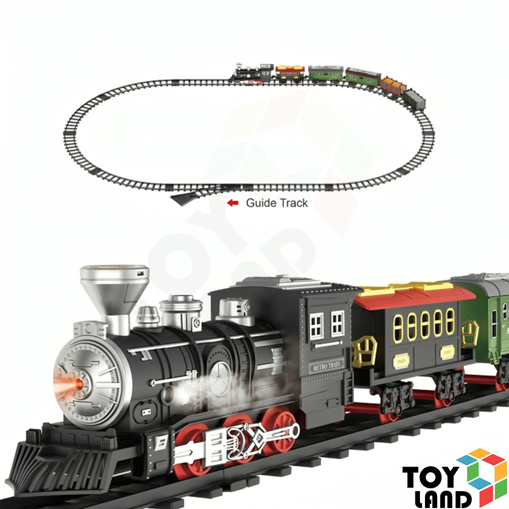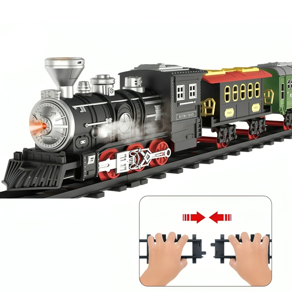 قطار لعب كهربائي مزود بمسار دائري كامل، يتميز بإضاءة أمامية ودخان واقعي مع عدة عربات متنوعة تعطي الأطفال تجربة لعب ممتعة مليئة بالإثارة والخيال. 🚂✨